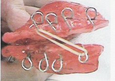 que pode ser construído da seguinte maneira: 3º- Num colchete pré-fabricado, destes usados na confecção de roupas, amarramos o fio de naylon em uma das extremidades. Medimos novamente o fio e verificamos o que falta para atingir a medida que desejamos instituir ao movimento, medimos o colchete e a diminuímos sua medida do comprimento do fio, medimos o colchete do ponto onde o fio vai ser amarrado e sua ponta ativa, diminuímos desta medida à que corresponde ao que foi perdido do comprimento desejado após ter sido amarrado o primeiro colchete e a diminuímos do comprimento do colchete e cortamos a diferença entre eles do fio, e então amarramos o colchete nesta ponta. Repetimos para confeccionarmos outro fio limitador de movimento para ser usado do lado oposto (para, por exemplo abertura bucal) e após mostrarmos ao cliente como prender os limitadores na placa, prescrevemos exercícios com o aparelho e limitador em posição, na freqüência que acharmos necessária. Estes exercícios podem ser feitos com elásticos oferecendo contra-resistência, o que pode favorecer a instituição do Molde Cortical pretendido. Desvantagens: -