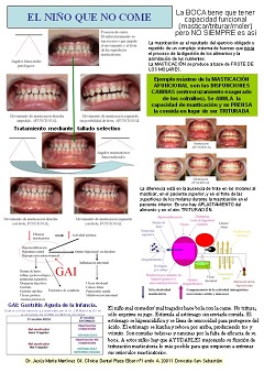 Póster sobre la limitación masticatoria en el niño que NO come, que le cuesta masticar y que tiene un comportamiento alimentario anómalo. Sobre el tratamiento desbloqueador de la masticación mediante tallado selectivo y su cambio INMEDIATO. |