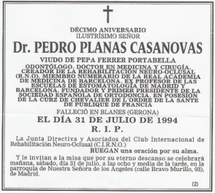 | En estos diez años no sólo nos abandonó Pedro Planas. También otros compañeros, amigos de la RNO y amigos de todos nosotros nos abandonaron dejándonos un poco más solos. Pero transmitiéndonos las ganas de seguir adelante luchando por el reconocimiento general de la RNO y de su creador Pedro Planas. Es difícil recordar a todos ellos, máxime formando un grupo internacional. De ahí la dificultad de nombrarlos a todos ellos. Carlos Nespral, Antonio Machado Capelas, Thomas van der Laan, Javier Orive, José Ramón Cirarda, María Angustias Jiménez de Gálvez, Isabel Vela, Jaime Cuenca y tantos otros que no conviene olvidar. Quiero recordar en nombre de todos a Isabel Vela, a quién yo más conocí de todos ellos y que siempre me dispensó su afecto. Se fue dejándonos su recuerdo y lo que más quería en sus últimos años: difundir la RNO. Para ello creó el Aula de RNO, hoy llamada Aula Isabel Vela, en Madrid con la finalidad de impartir enseñanza de RNO a través de distintos compañeros que colaboraban con ella. Felizmente ese proyecto sigue en marcha, después de su desaparición, gracias a la gestión y esfuerzo de su amiga Dolores Barata. Disfrutará desde ese cielo que la acoge, junto a Pedro Planas y los demás amigos de la Rehabilitación Neuro Oclusal que allí están, viendo cómo se forman nuevos compañeros. Y quiero pensar también que disfrutará viendo como seguimos luchando por difundir la obra de nuestro maestro Pedro Planas. Convendrá, pues, recordarlos para que puedan seguir vivos en nuestra memoria.