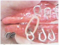 que pode ser construído da seguinte maneira: 3º- Num colchete pré-fabricado, destes usados na confecção de roupas, amarramos o fio de naylon em uma das extremidades. Medimos novamente o fio e verificamos o que falta para atingir a medida que desejamos instituir ao movimento, medimos o colchete e a diminuímos sua medida do comprimento do fio, medimos o colchete do ponto onde o fio vai ser amarrado e sua ponta ativa, diminuímos desta medida à que corresponde ao que foi perdido do comprimento desejado após ter sido amarrado o primeiro colchete e a diminuímos do comprimento do colchete e cortamos a diferença entre eles do fio, e então amarramos o colchete nesta ponta. Repetimos para confeccionarmos outro fio limitador de movimento para ser usado do lado oposto (para, por exemplo abertura bucal) e após mostrarmos ao cliente como prender os limitadores na placa, prescrevemos exercícios com o aparelho e limitador em posição, na freqüência que acharmos necessária. Estes exercícios podem ser feitos com elásticos oferecendo contra-resistência, o que pode favorecer a instituição do Molde Cortical pretendido. Desvantagens: -